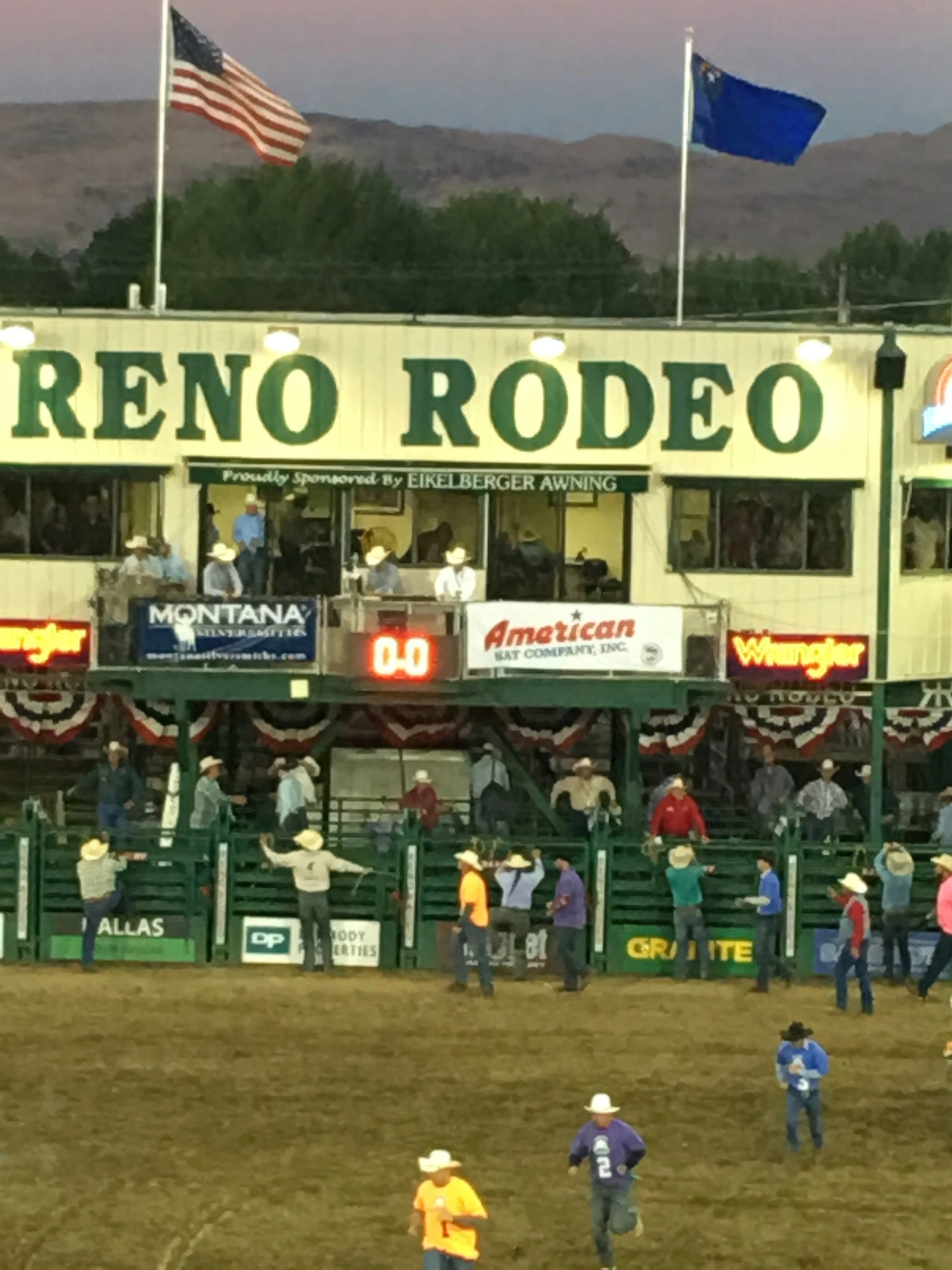 Maria Pirraglia wearing cowgirl attire, American flag western hat, red and silver bone choker, white fringe cropped jacket, and red maxi dress at Reno Rodeo